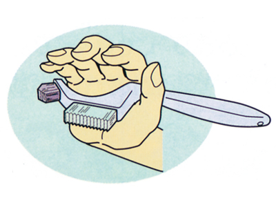 ・独自のフォルムと密毛ヘッドで使いやすさと清掃性を追求した義歯ブラシ。